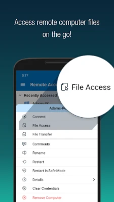 Kontroller din fjernsession ned til mindste detalje med et væld af kraftfulde funktioner. Overfør nemt filer mellem dine Android-enheder og computere, optag hele fjernsessioner, og styr udklipsholderhandlinger direkte fra din mobile enhed. RemotePC giver dig også mulighed for at låse fjernsystemer, ændre skærmopløsninger og endda genstarte systemer i sikker tilstand. For at øge sikkerheden kan du aktivere 'Pålidelige Enheder' og benytte 'Tom Værtsskærm' for privat arbejde. De seneste opdateringer introducerer endvidere mulighed for at tilføje kommentarer til konfigurerede enheder, forbedret filhåndtering med søge-, upload- og downloadfunktioner, samt muligheden for at rydde gemte legitimationsoplysninger for øget kontrol over din konto. Få adgang til logs og låste enheder, udskriv dokumenter eksternt, og brug den indbyggede chat eller whiteboard-funktion for effektiv kommunikation og samarbejde.