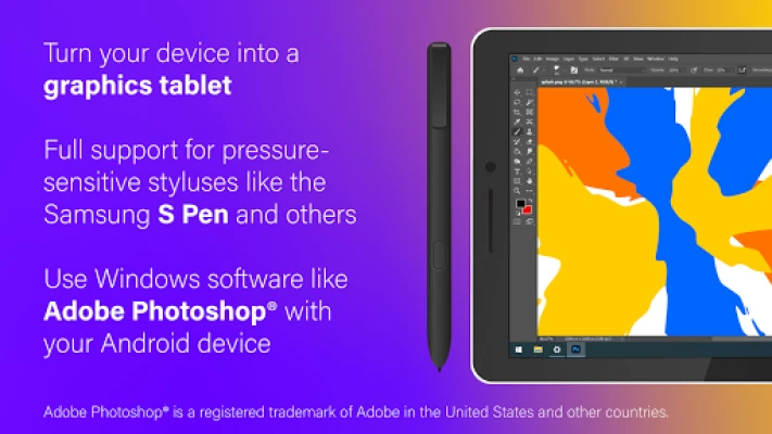 Men SuperDisplay er mere end blot en ekstra skærm. Den transformerer din Android-enhed til en kraftfuld digital grafiktablet. Takket være den indbyggede trykfølsomhed kan du udnytte potentielle muligheder med en stylus, som f.eks. Samsung S Pen, til fulde. Dette åbner op for en verden af kreativitet, hvor du kan tegne, male og redigere med enestående præcision direkte på din enhed i professionelle applikationer som Adobe Photoshop®. SuperDisplay er det ideelle værktøj for kunstnere, designere og alle, der kræver præcis digital interaktion, og omdanner dit mobile device til et alsidigt kunstværktøj.